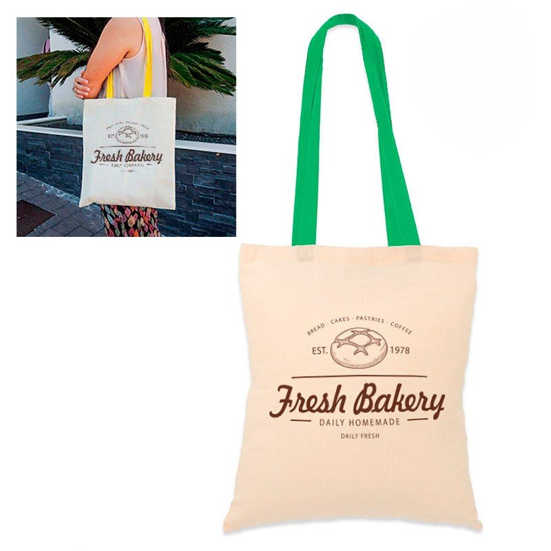 Tote bag de algodón 100% de 105gs y asas de colores ideal para personalizar con tu foto, imagen o texto favoritos.